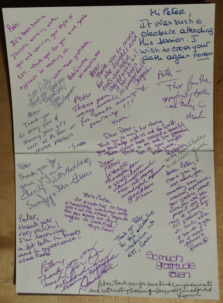I thought that the combination of material taught, demonstrations and breaking into pairs was balanced excellently. I feel that I learned a lot about different techniques. Peter really cared about the participants and showed an attitude that we all need to hold when working with clients. He also communicated his enthusiasm for EFT and changing the world. I have had many transformations since Workshop I and am working on my own and with EFT practitioners to move myself forward. I have also been giving EFT sessions and have watched amazing transformations in people! Barbara Rosenthal, Teacher, New York.